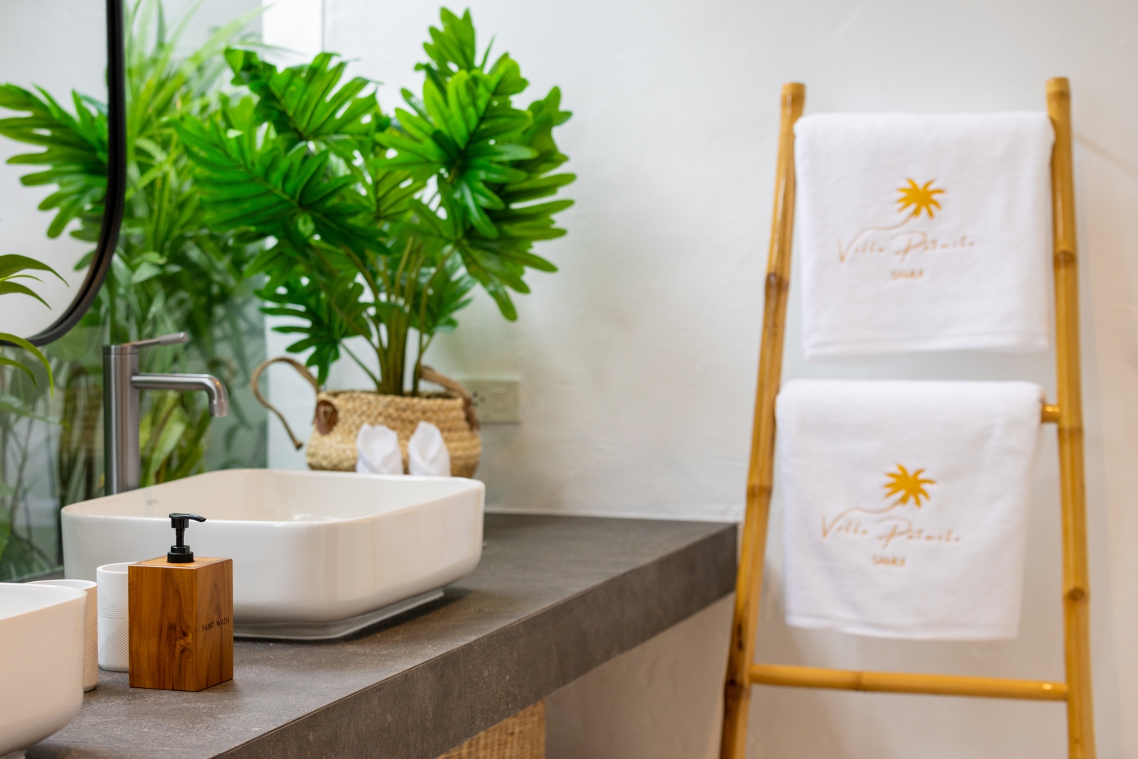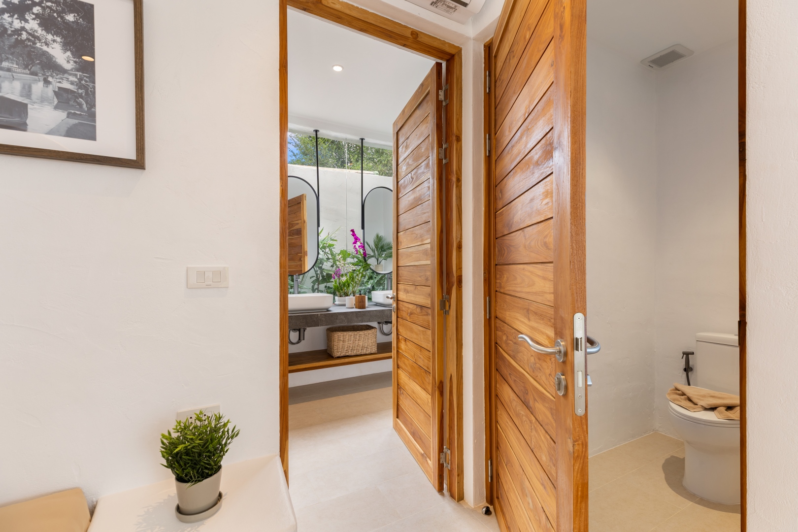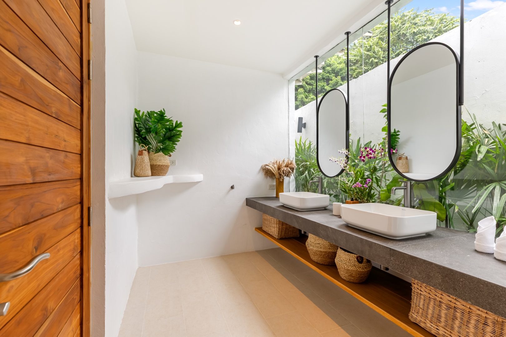 - Salle de bain attenante avec deux vasques, douche à effet pluie